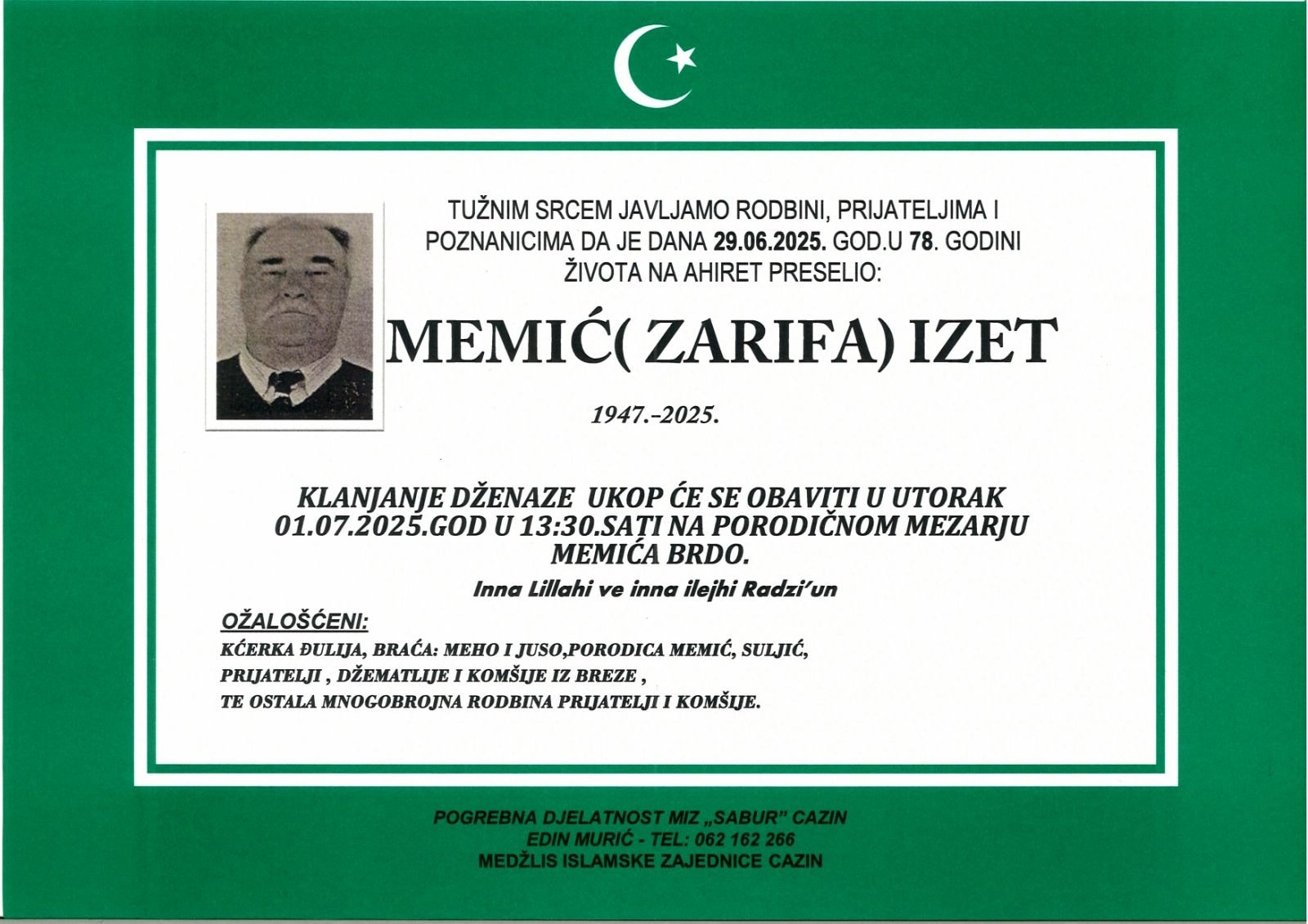 TUŽNIM SRCEM JAVLJAMO RODBINI, PRIJATELJIMA I POZNANICIMA DA JE DANA 29.06.2025. GOD. U 78. GODINI ŽIVOTA NA AHIRET PRESELIO MEMIĆ (ZARIFA) IZET.