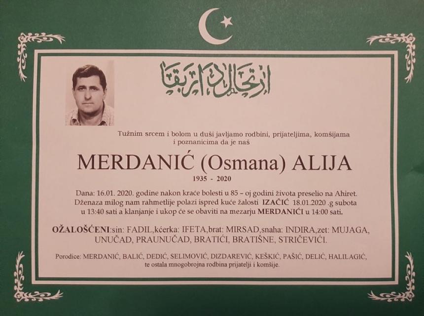 Tužnim srcem i bolom u duši javljamo rodbini i prijateljima da je naš dragi Merdanić (Osmana) Alija dana 16.01.2020. godine u 85-toj godini života preselio na Ahiret nakon kraće bolesti.