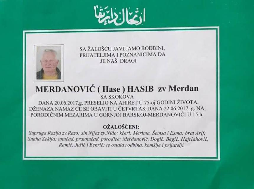 Tužnim srcem i bolom u duši javljamo rodbini,prijateljima i komšijama da nas je naš dragi Nadarević (Hase) Hasib zvani Merdan napustio u 75.-oj godini života dana 20.06.2017.godine.