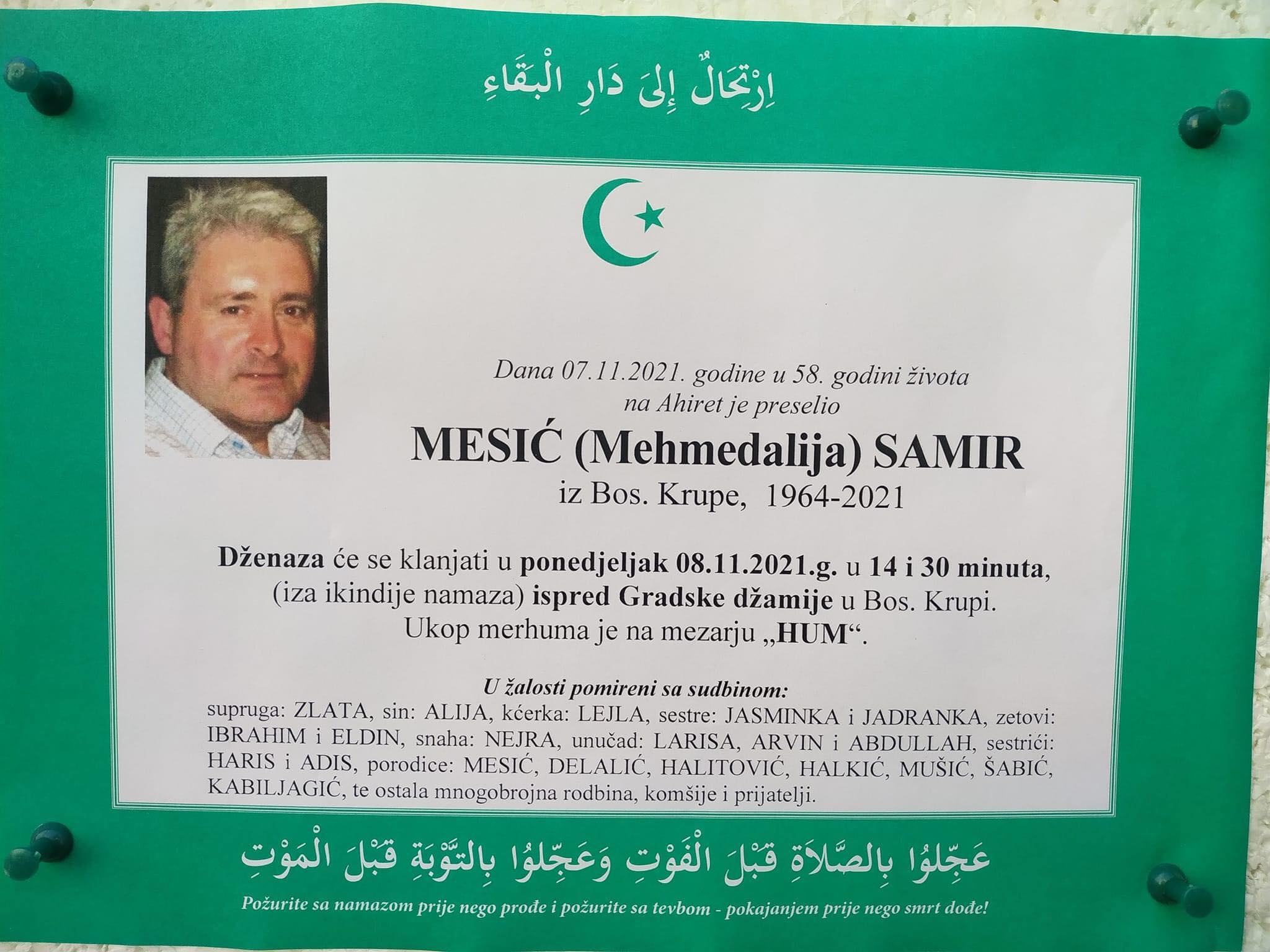Tužnim srcem javljamo rodbini prijateljima i komšijama da je naš dragi Mesić (Mehmedalija) Samir, dana 07.11.2021. godine, u 58-oj godini života, preselio na Ahiret.