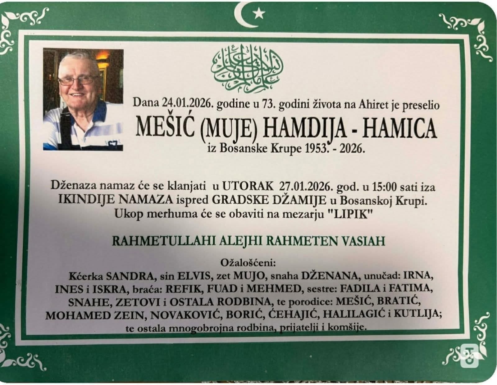 Dženaza-namaz će se klanjati u utorak, 27.01.2026. godine, u 15:00 sati, iza ikindije-namaza, ispred Gradske džamije u Bosanskoj Krupi.
