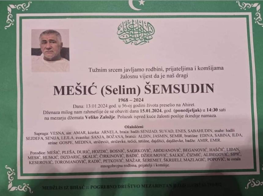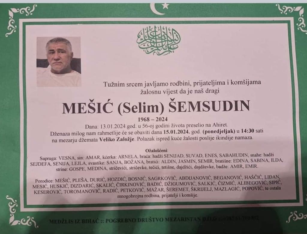 Tužnim srcem javljamo porodici, prijateljima i komšijama da je dana 13.01.2024. god. u 56. godini života na Ahiret preselio Mešić (Selim) Šemsudin.