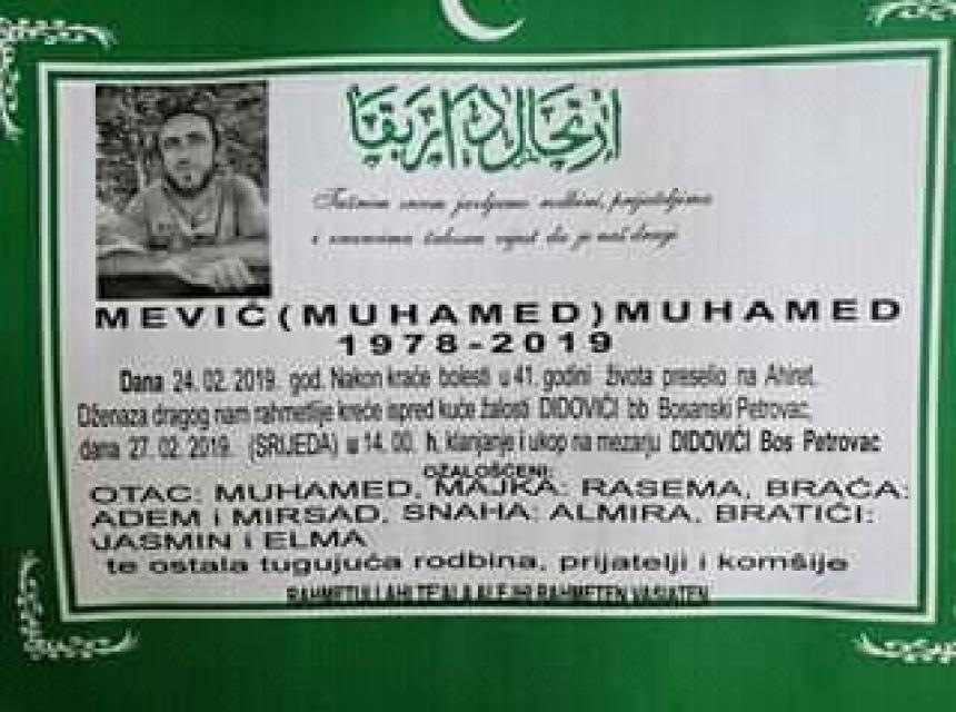 Tužnim srcem i bolom u duši javljamo rodbini, prijateljima i komšijama da je 24.02.2019.g. u 41.godini života na Ahiret preselio Mević (Muhamed) Muhamed.