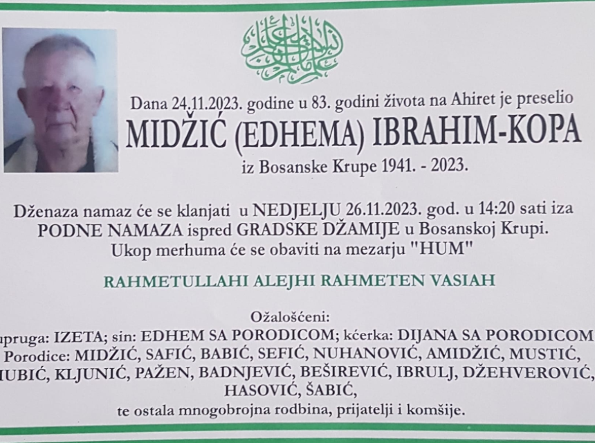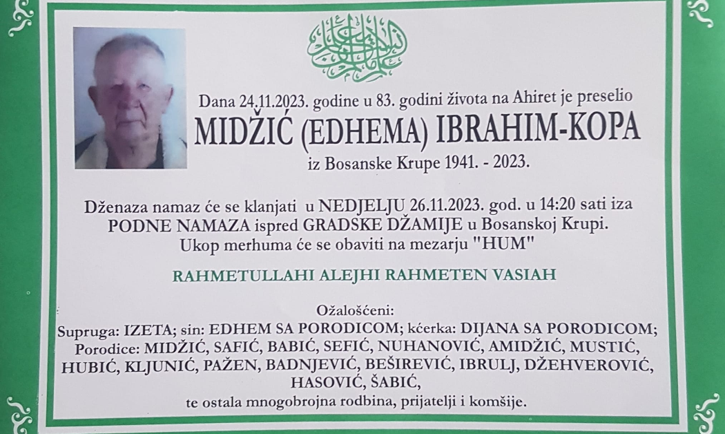 Dana 24.11.2023. godine u 83. godini života na Ahiret je preselio MIDŽIĆ (EDHEMA) IBRAHIM-KOPA.