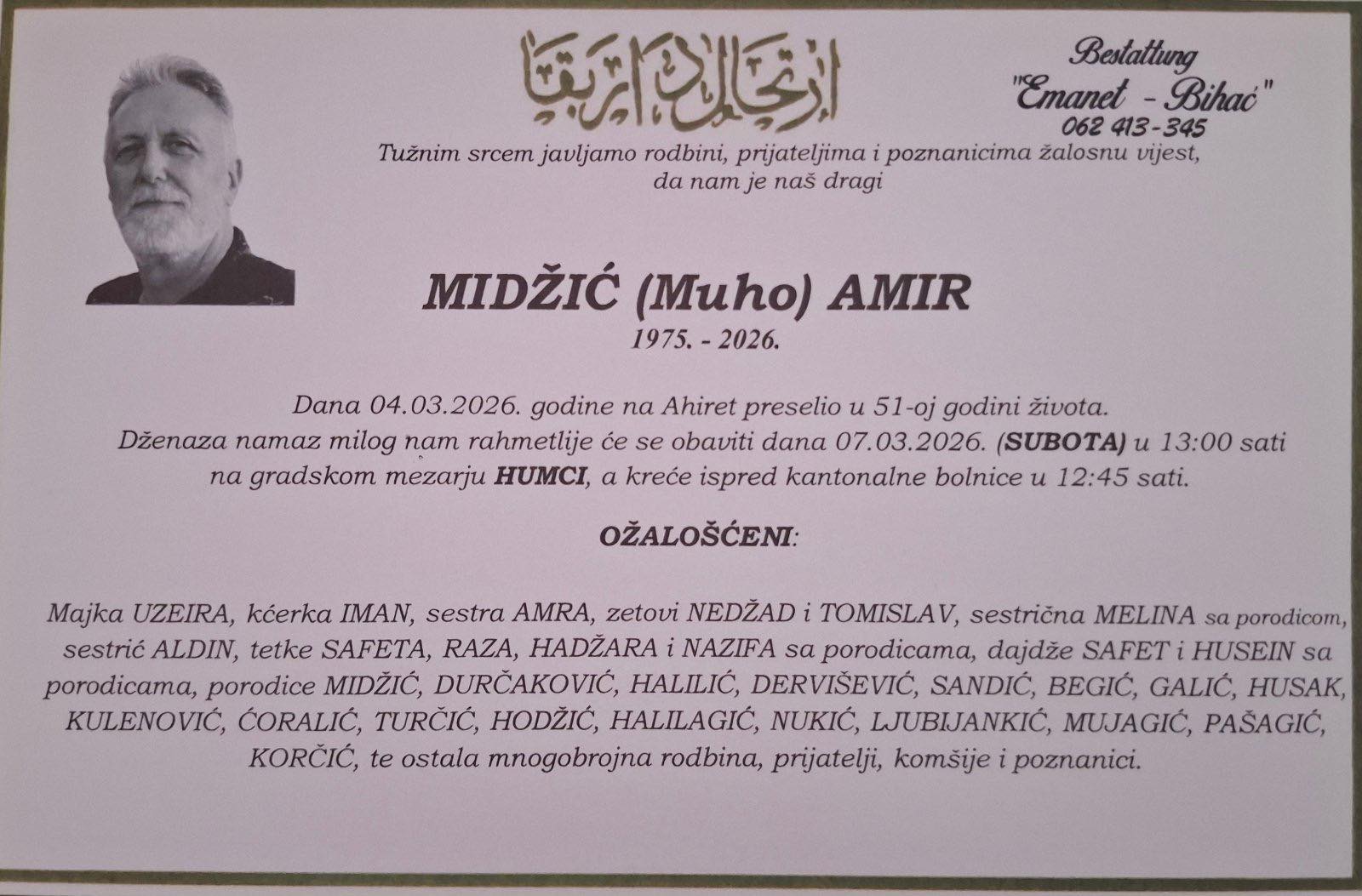 Tužnim srcem javljamo rodbini, prijateljima i poznanicima žalosnu vijest, da nam je naš dragi MIDŽIĆ (Muho) AMIR dana 04.03.2026. godine na Ahiret preselio u 51-oj godini života.