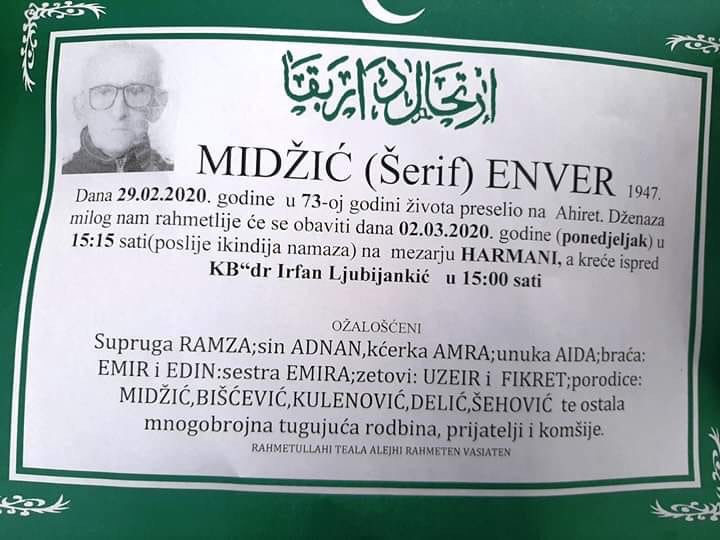 Tužnog srca i s bolom u duši obavještavamo rodbinu, komšije i prijatelje da je dana 29.02.2020., u 73-oj godini života, na Ahiret preselio Midžić (Šerif) Enver.