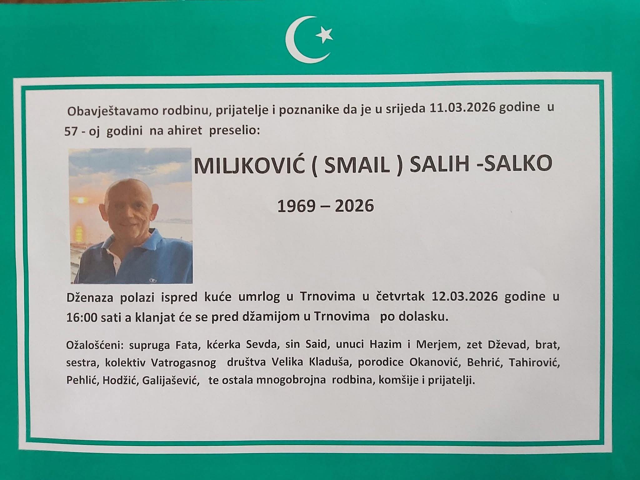 Obavještavamo rodbinu, prijatelje i poznanike da je u srijeda 11.03.2026 godine u 57-oj godini na ahiret preselio: