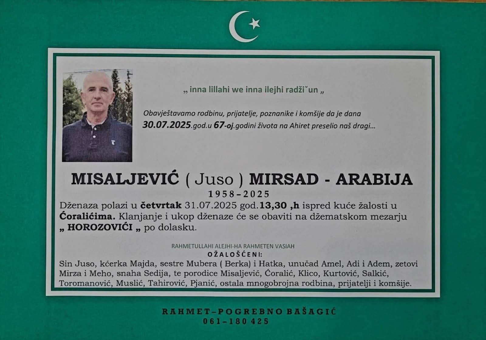 Dženaza polazi u četvrtak 31.07.2025. god. u 13,30 h ispred kuće žalosti u Ćoralićima.
