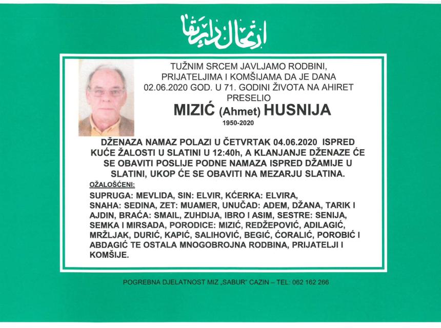 Teškim srcem i bolom u duši javljamo da je naš dragi i nikad prežaljeni Mizić (Ahmet) Husnija dana 02.06.2020.godine u 71-oj godini života preselio na Ahiret.