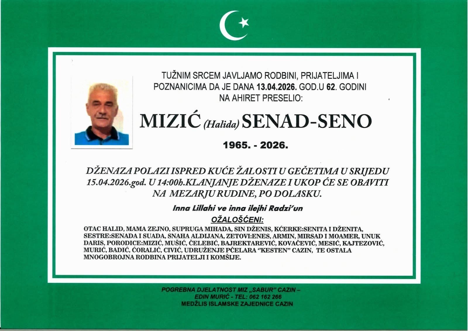 Tužnim srcem javljamo rodbini, prijateljima i poznanicima da je dana 13.04.2026. godine u 62. godini na Ahiret preselio: