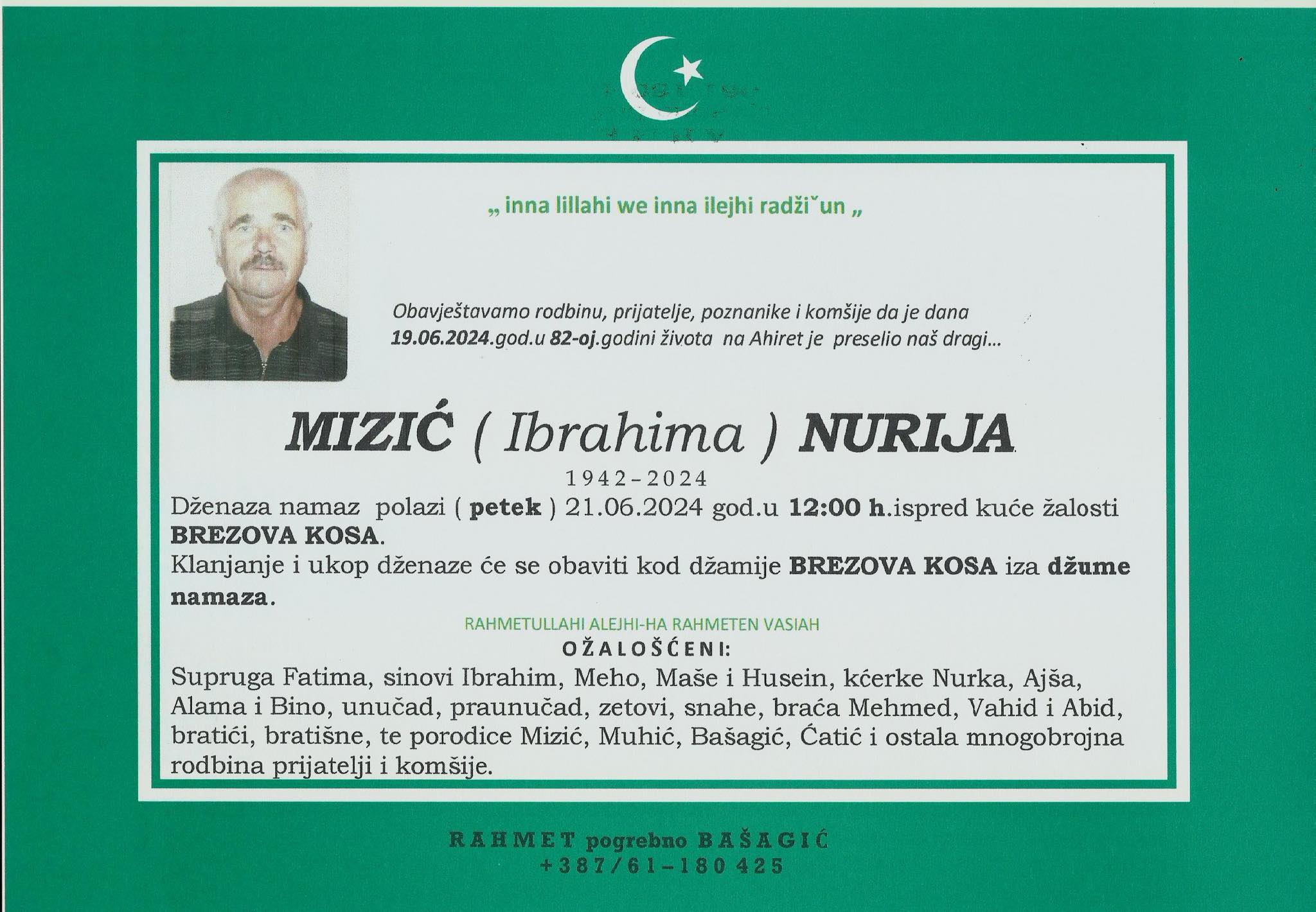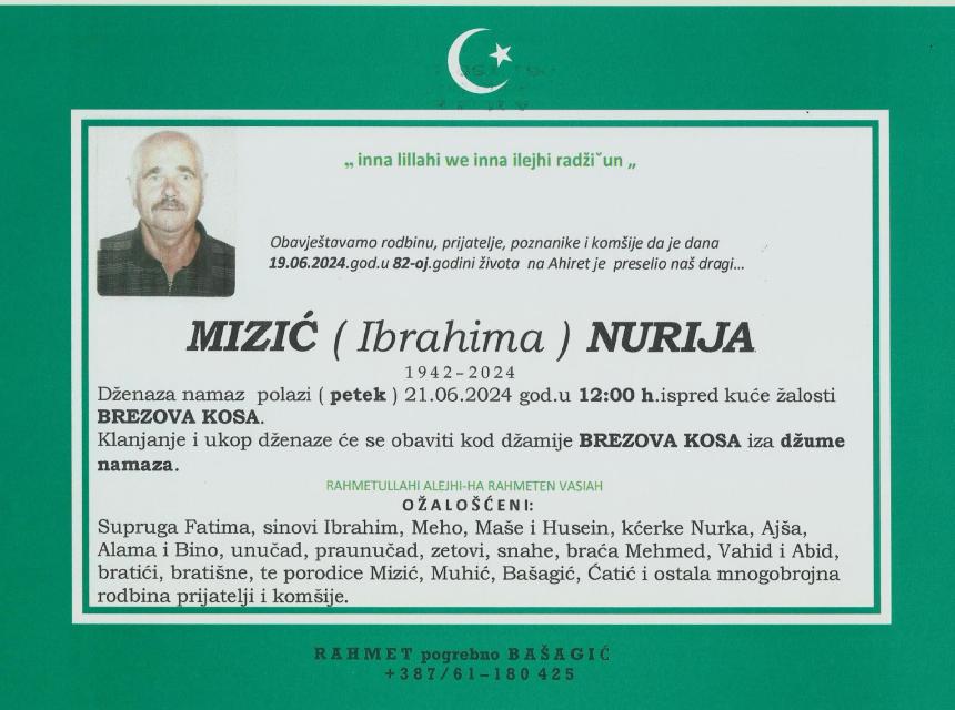 Tužnim srcem i bolom u duši javljamo rodbini, prijateljima i komšijama da je naš dragi Mizić (Ibrahima) Nurija, dana 19.06.2024. godine u 82-oj godini života, preselio na Ahiret.