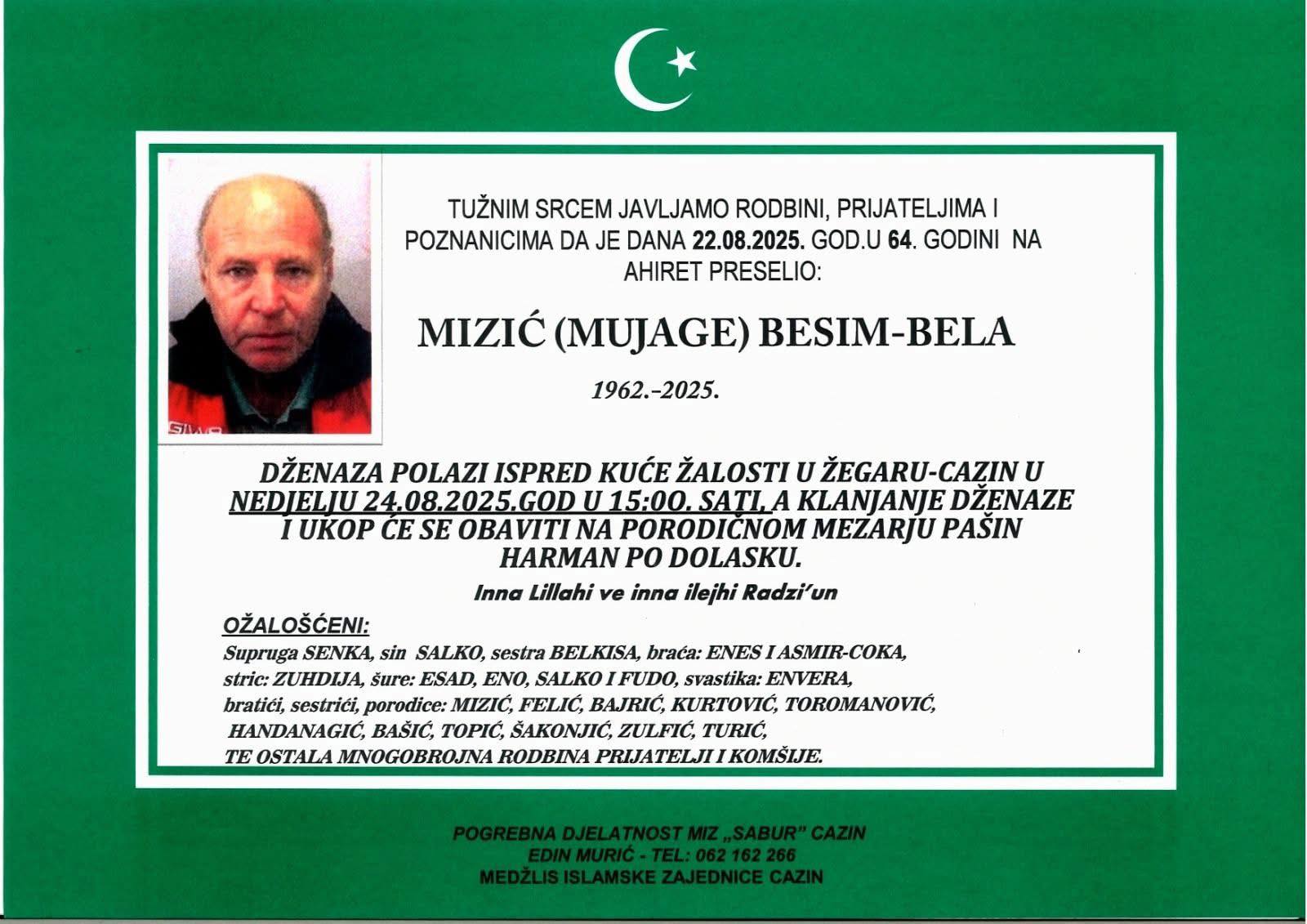 Tužnim srcem i bolom u duši javljamo rodbini, prijateljima i komšijama da je naš dragi Mizić (Mujage) Besim - Bela, dana 22.08.2025. godine u 64-oj godini života, preselio na Ahiret.
