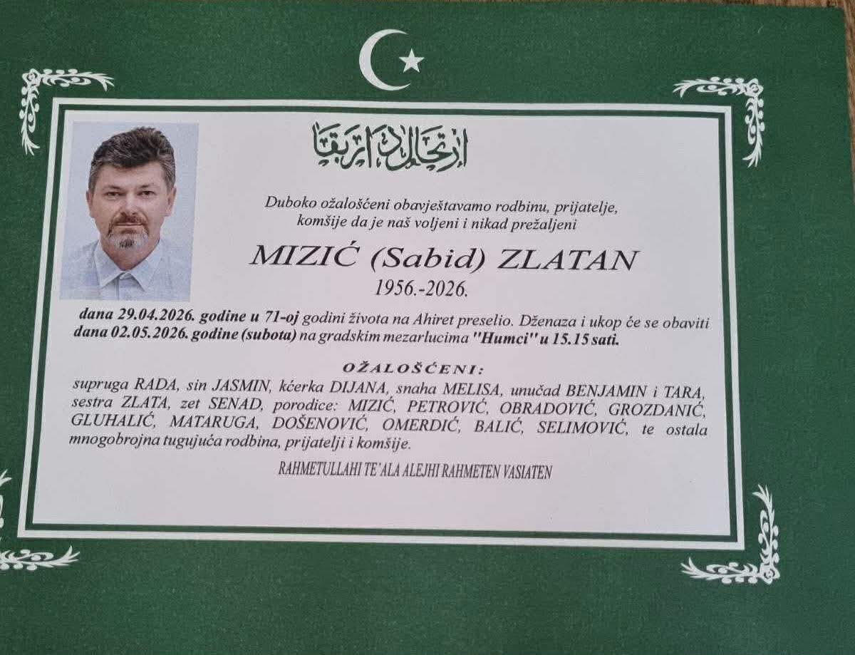 Dženaza i ukop će se obaviti dana 02.05.2026. godine (subota) na gradskim mezarlucima "Humci" u 15.15 sati.