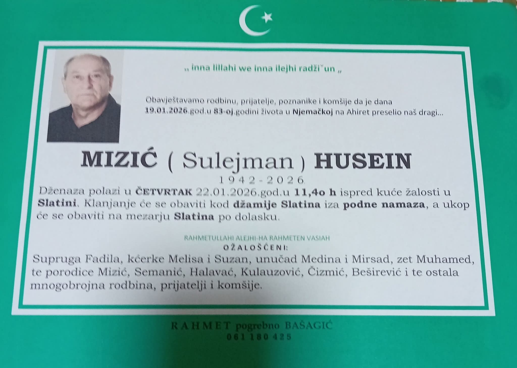 Dženaza polazi u ČETVRTAK 22.01.2026. god. u 11,40 h ispred kuće žalosti u Slatini, klanjanje će se obaviti kod džamije Slatina iza podne namaza, a ukop će se obaviti na mezarju Slatina po dolasku.