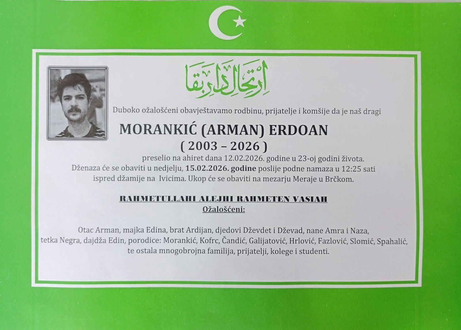 Tužnim srcem i bolom u duši javljamo rodbini, prijateljima i komšijama da je naš dragi Morankić (Arman) Erdoan, dana 12.02.2026. godine u 23-oj godini života, tragično preselio na Ahiret.