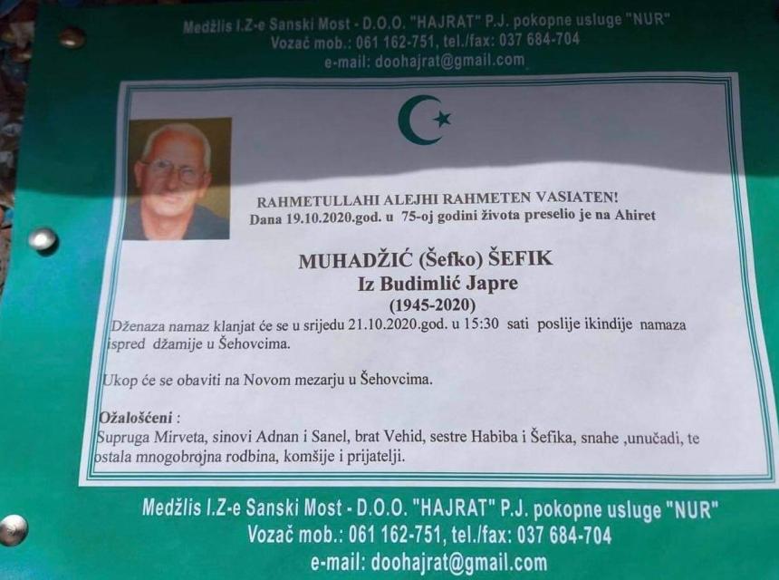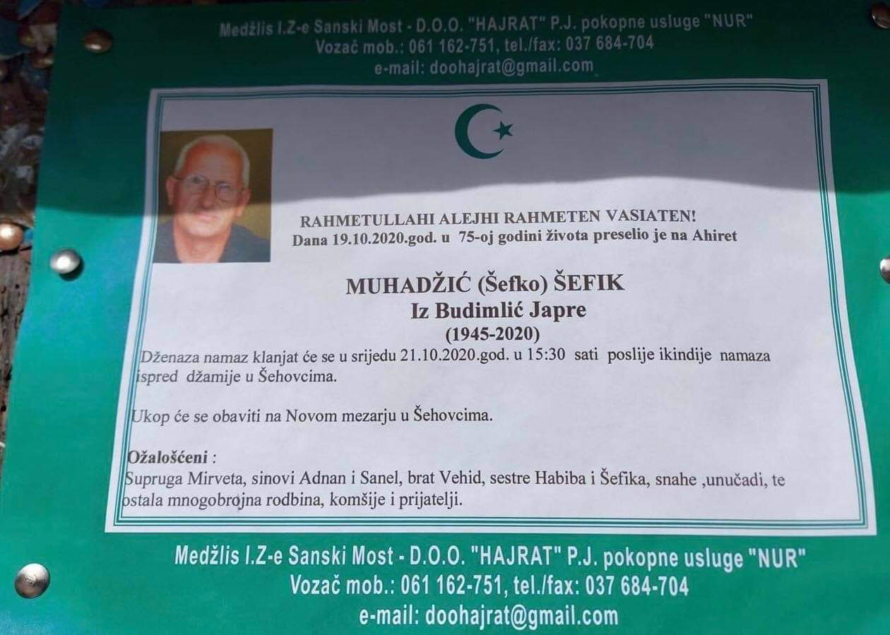 Tužnog srca i s bolom u duši obavještavamo rodbinu, komšije i prijatelje da je naš dragi Muhadžić (Šefko) Šefik 19. oktobra 2020. godine, u 75. godini života, preselio na Ahiret.