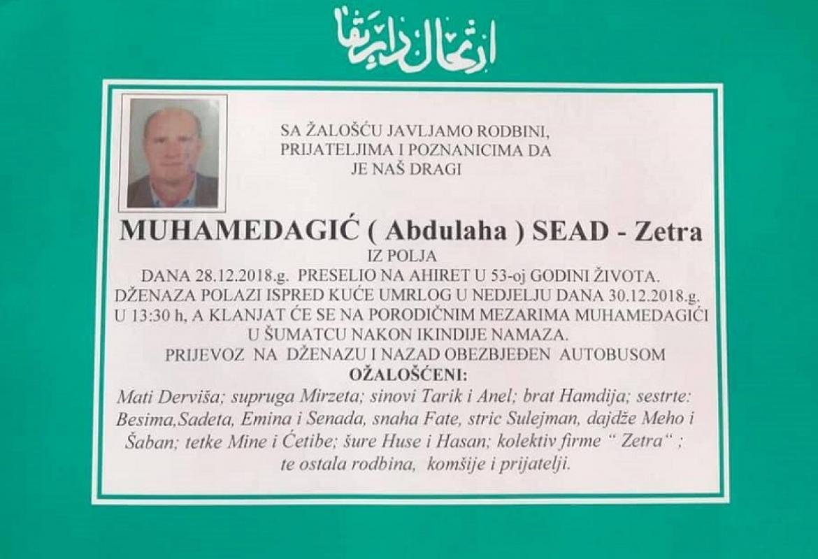 Sa žalošću javljamo rodbini, prijateljima i poznanicima da je 28.12.2018.godine u 53-oj godini života na Ahiret preselio naš dragi Muhamedagić (Abdulaha) Sead - Zetra.