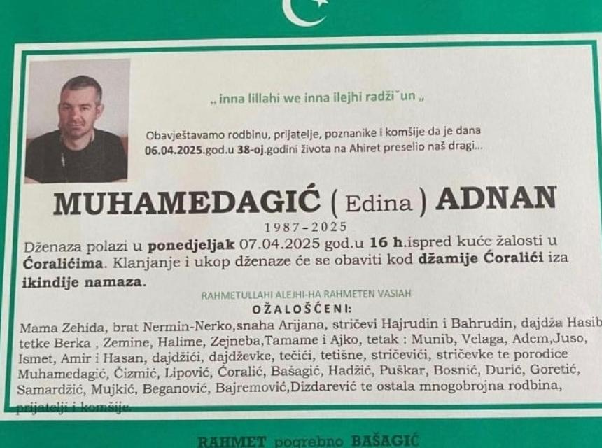 Tužnim srcem i bolom u duši javljamo rodbini, prijateljima i komšijama da je naš dragi Muhamedagić (Edina) Adnan dana 06.04.2025. godine u 38-oj godini života, preselio na Ahiret.