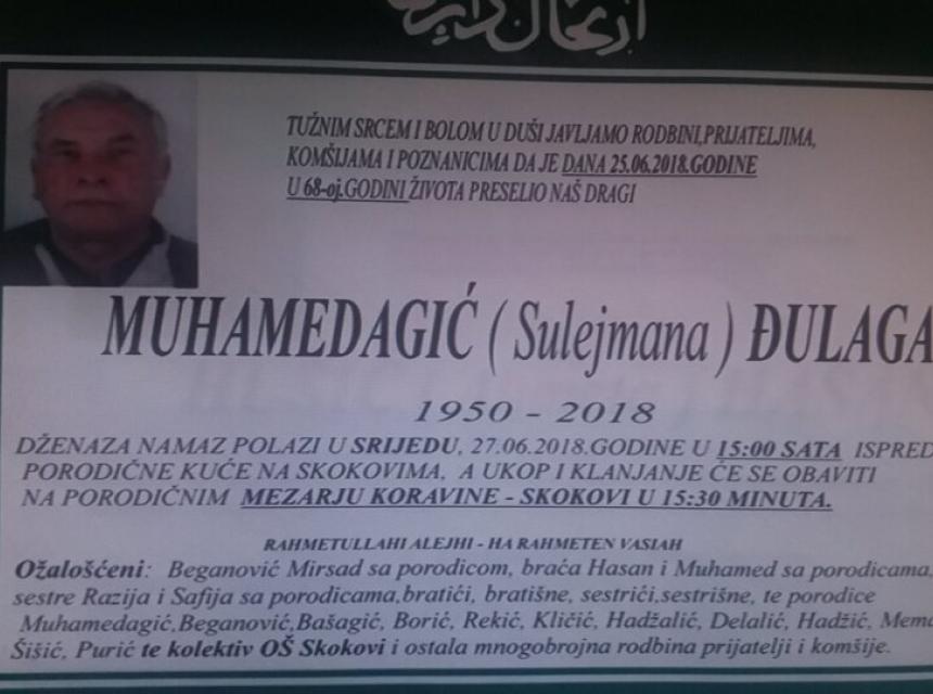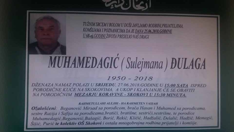 Tužnim srcem i bolom u duši javljamo rodbini, prijateljima, komšijama i poznanicima da je dana 25-6-2018.godine u 68-oj godini života preselio naš dragi Muhamedagić (Sulejmana) Đulaga.