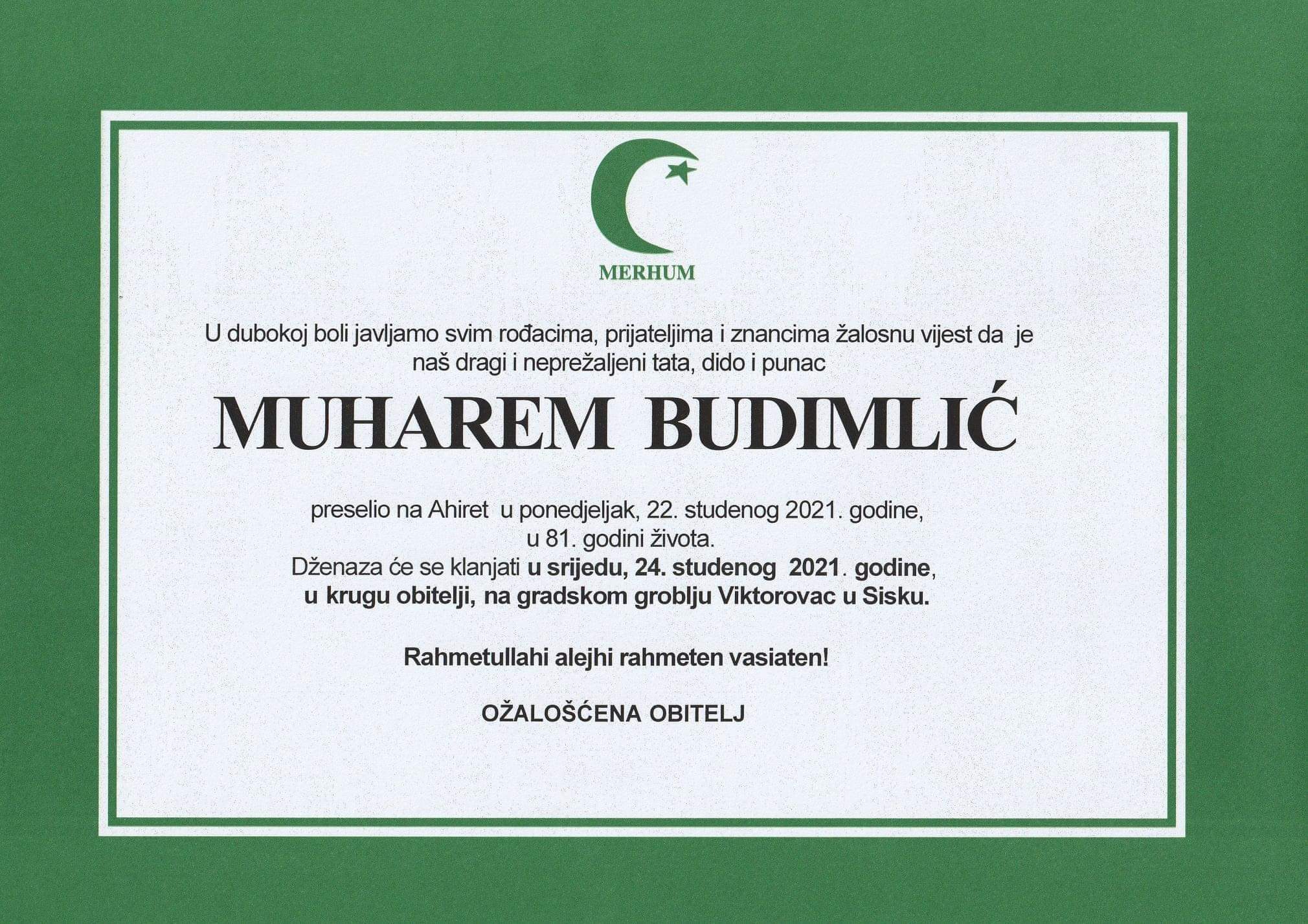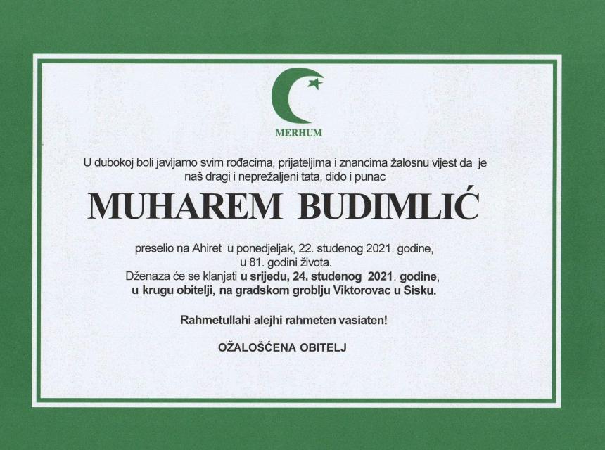 Tužnog srca i s bolom u duši obavještavamo rodbinu, komšije i prijatelje da je naš dragi Muharem Budimlić dana 22.11.2021. u 81. godini života preselio na ahiret.