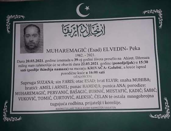 Tužnog srca i s bolom u duši obavještavamo rodbinu, komšije i prijatelje da je naš dragi Muharemagić (Esad) Elvedin - Peka, 20.03.2021. godine, u 39. godini života preselio na Ahiret.