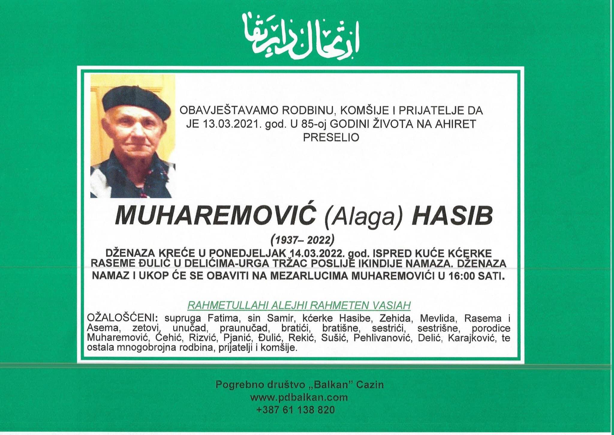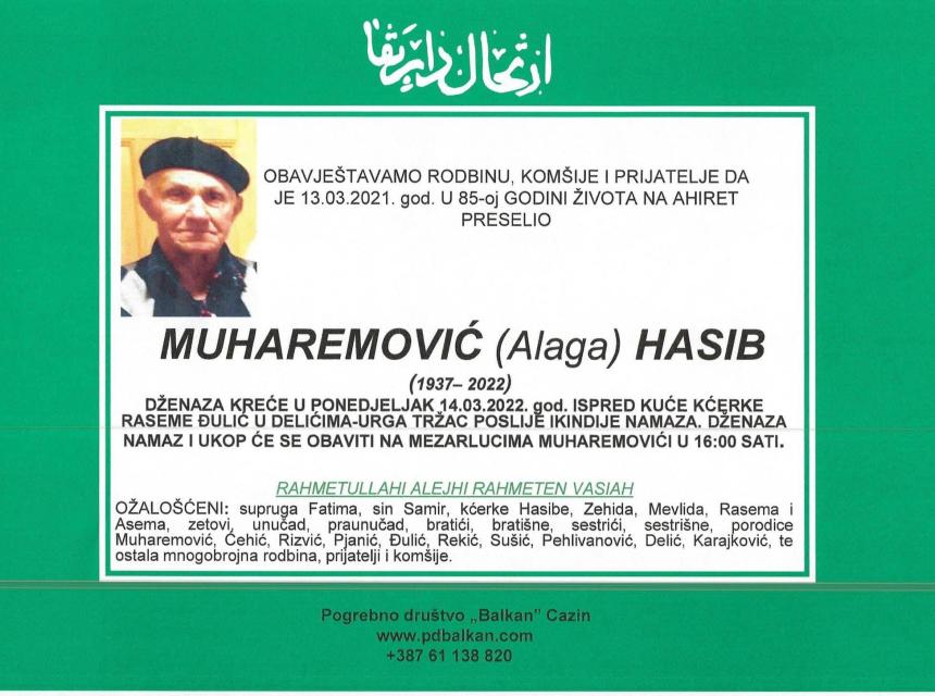 Tužnog srca i s bolom u duši obavještavamo rodbinu, komšije i prijatelje da je naš dragi Muharemović (Alaga) Hasib 13.03.2022. u 85. godini života preselio na Ahiret.