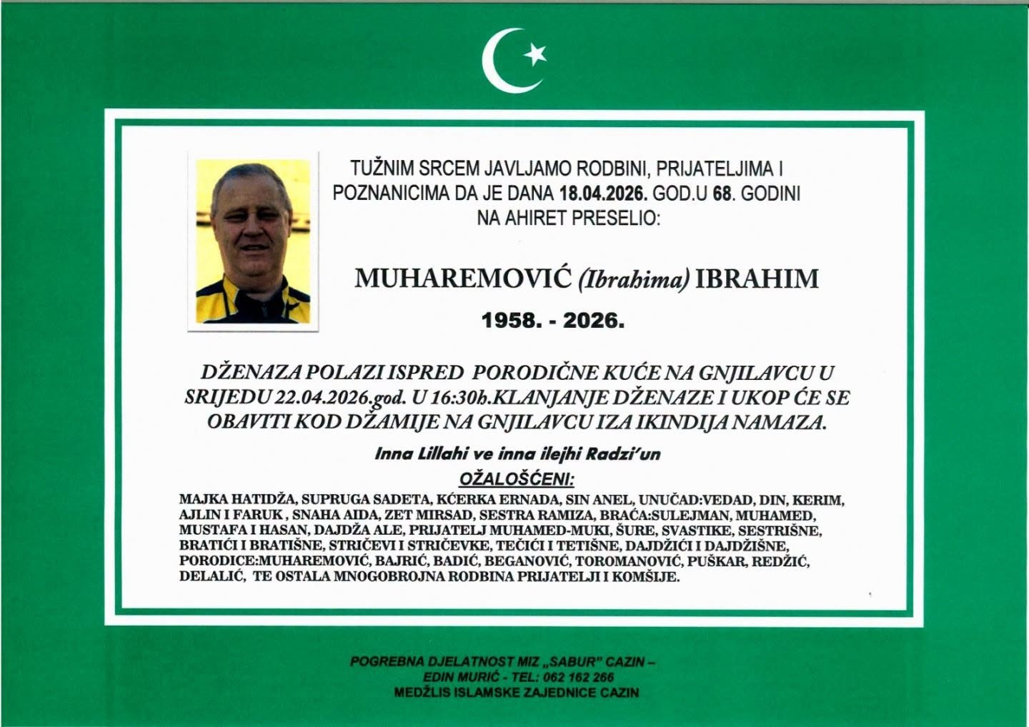 DŽENAZA POLAZI ISPRED PORODIČNE KUĆE NA GNJILAVCU U SRIJEDU 22.04.2026.god. U 16:30h.KLANJANJE DŽENAZE I UKOP ĆE SE OBAVITI KOD DŽAMIJE NA GNJILAVCU IZA IKINDIJA NAMAZA.