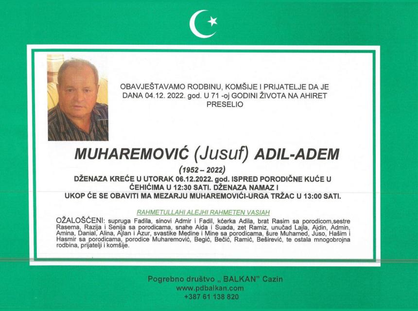 Tužnog srca i s bolom u duši obavještavamo rodbinu, komšije i prijatelje da je naš dragi Muharemović (Jusuf) Adil-Adem, u 71. godini zivota preselio na Ahiret.