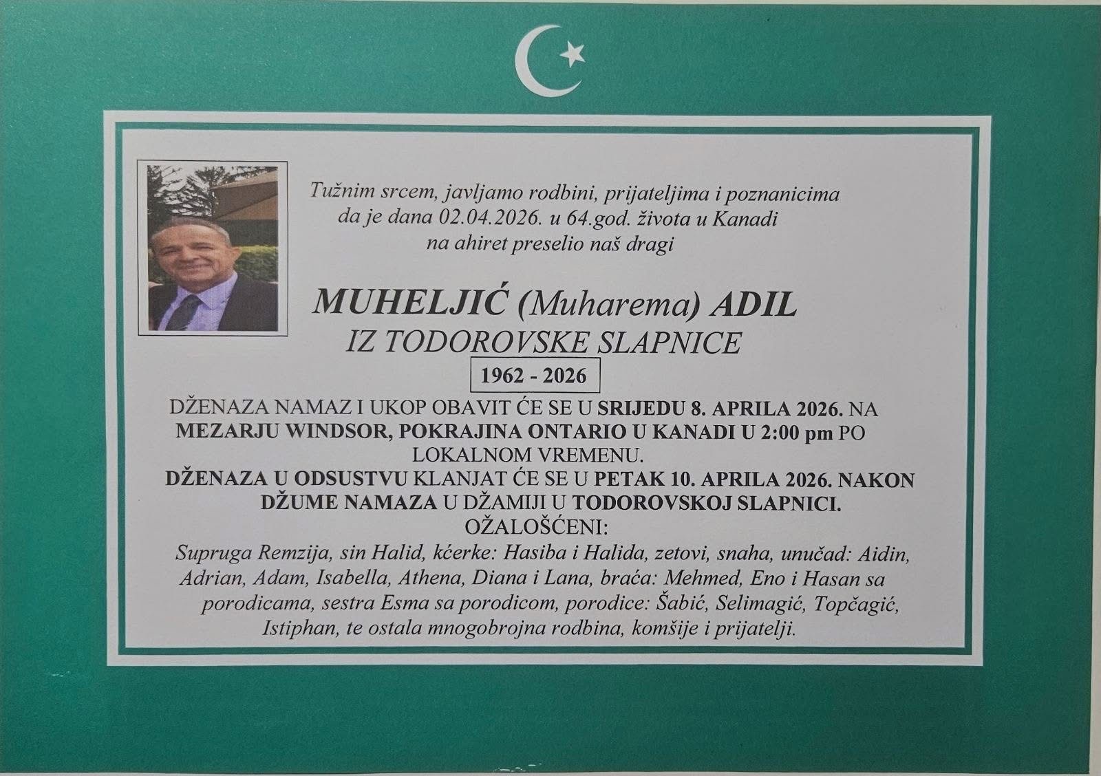 Dženaza u odsustvu klanjat će se u petak, 10. aprila 2026. godine, nakon džume-namaza u džamiji u Todorovskoj Slapnici.