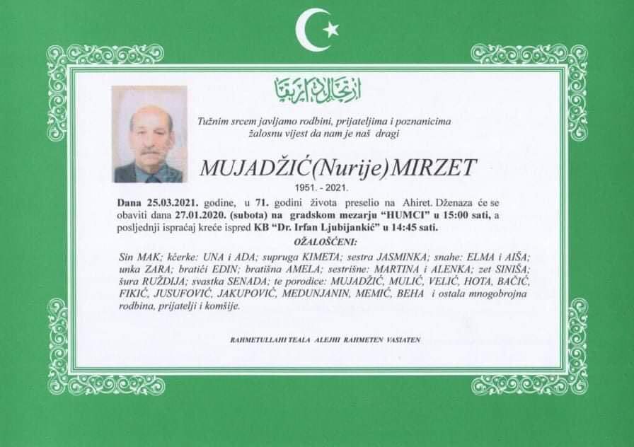 Tužnog srca i s bolom u duši obavještavamo rodbinu, komšije i prijatelje da je naš dragi Mujadžić (Nurije) Mirzet 25.03.2021. godine, u 71. godini života preselio na Ahiret.