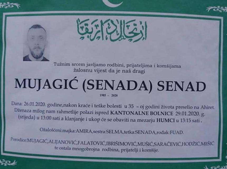 Tužnim srcem javljamo rodbini, prijateljima i komšijama da je naš dragi Mujagić (Senada) Senad preselio na Ahiret dana 26.02.2020. godine nakon kraće bolesti u 35. godini života.
