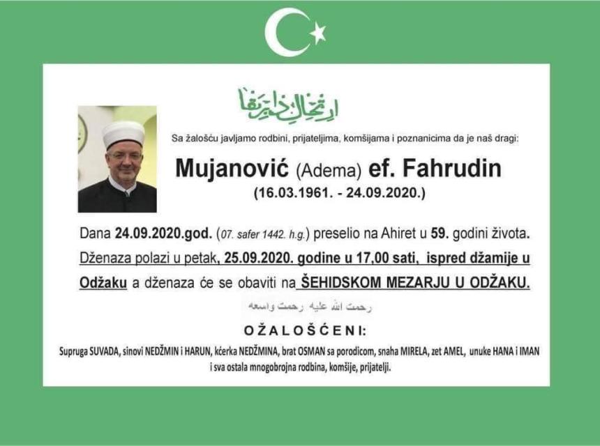 Tužnog srca i s bolom u duši obavještavamo rodbinu, komšije i prijatelje da je naš dragi Mujanović (Adema) ef. Fahrudin preselio na Ahiret, dana 24. septembra 2020. godine, u 59. godini života.