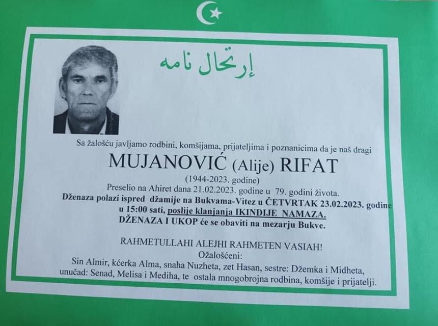 Tužnog srca i s bolom u duši obavještavamo rodbinu, komšije i prijatelje da je naš dragi Mujanović (Alije) Rifat, dana 21.02.2023 godine na ahiret preselio u 79-oj godini života.