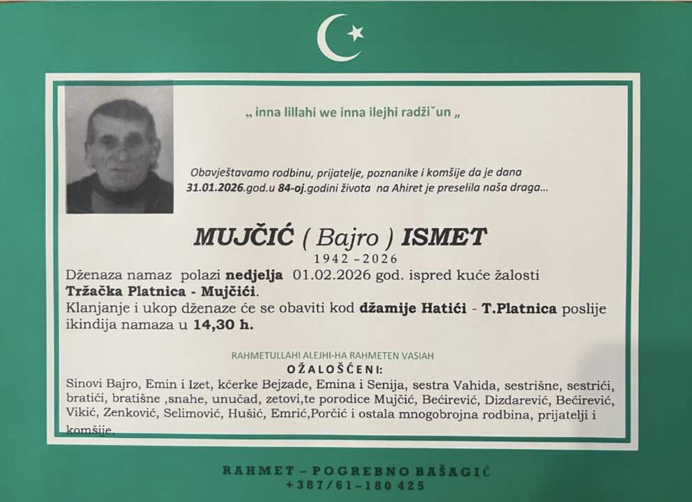 Tužnim srcem i bolom u duši javljamo rodbini, prijateljima i komšijama da je naš dragi Mujčić (Bajro) Ismet, dana 31.01.2026. godine u 84-oj godini života, preselio na Ahiret.