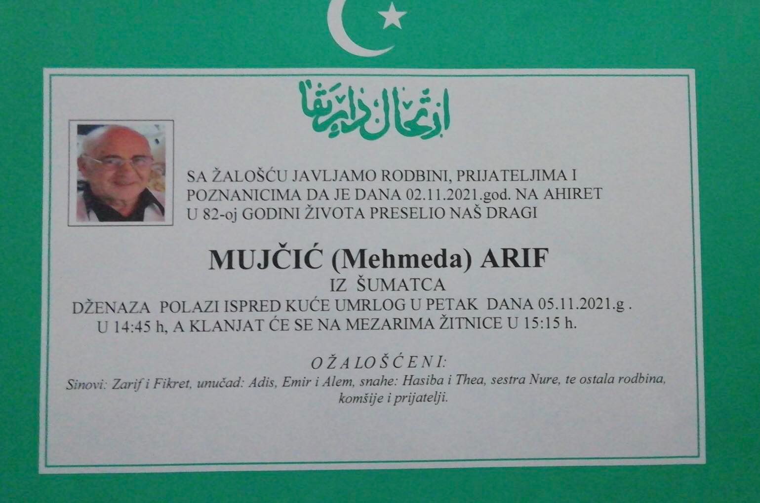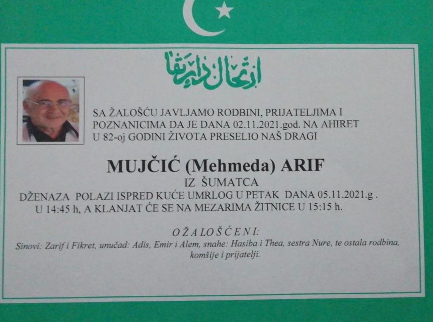 Tužnog srca i s bolom u duši obavještavamo rodbinu, komšije i prijatelje da je naš dragi Mujčić (Mehmeda) Arif, dana 02.11.2021. godine, u 82-oj godini života, preselio na Ahiret.