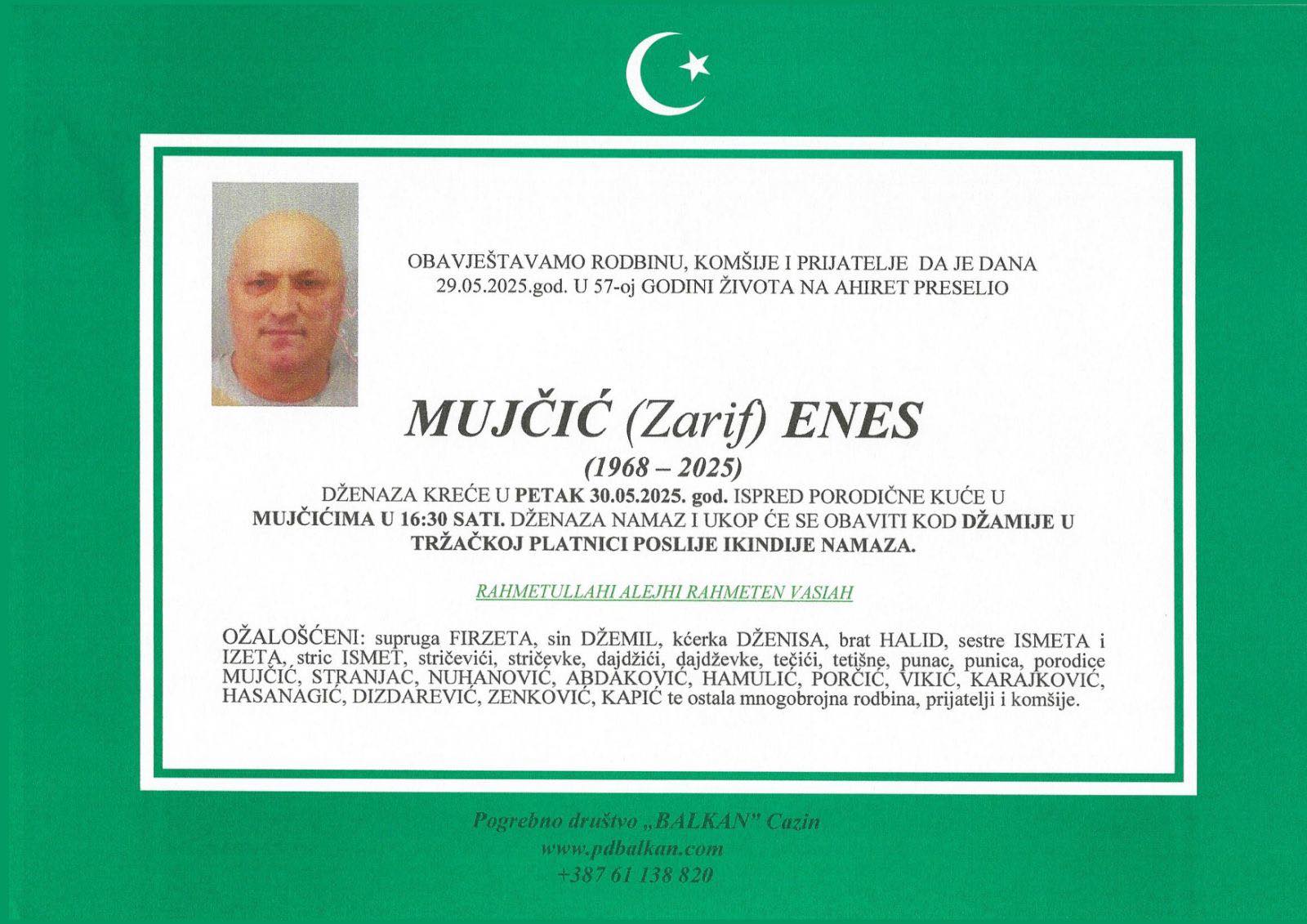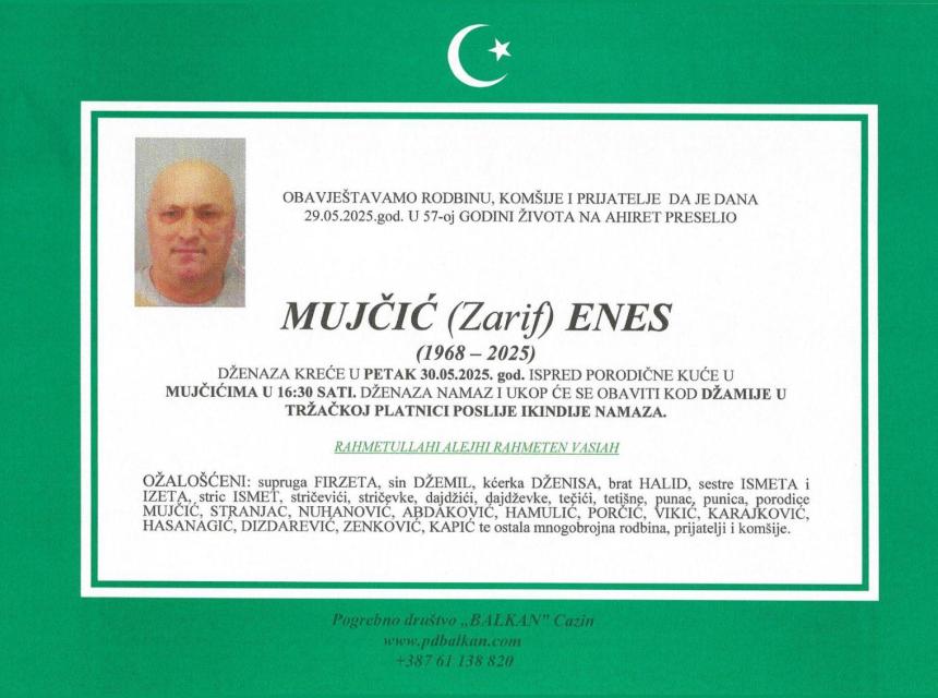Tužnim srcem javljamo rodbini, prijateljima i poznanicima da je dana 29.05.2025. godine u 57. godini života, na ahiret preselio Mujčić (Zarif) Enes.