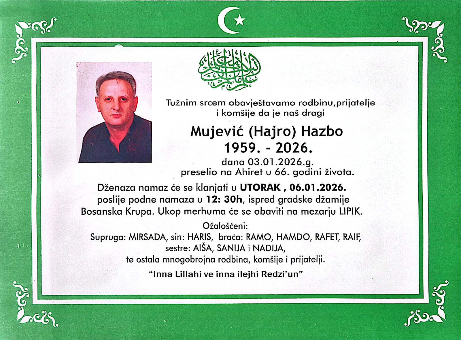 Tužnim srcem obavještavamo rodbinu,prijatelje i komšije da je naš dragi Mujević (Hajro) Hazbo dana 03.01.2026.g. preselio na Ahiret u 66. godini života.