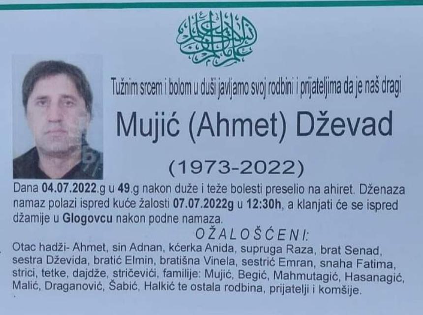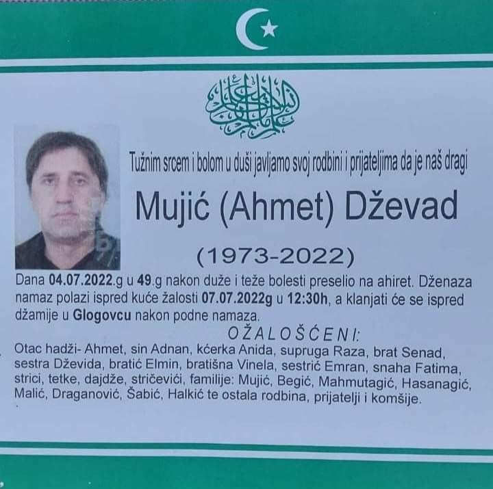 Tužnog srca i s bolom u duši obavještavamo rodbinu, komšije i prijatelje da je naš dragi Mujić (Ahmet) Dževad u 49. godini života preselio na Ahiret.
