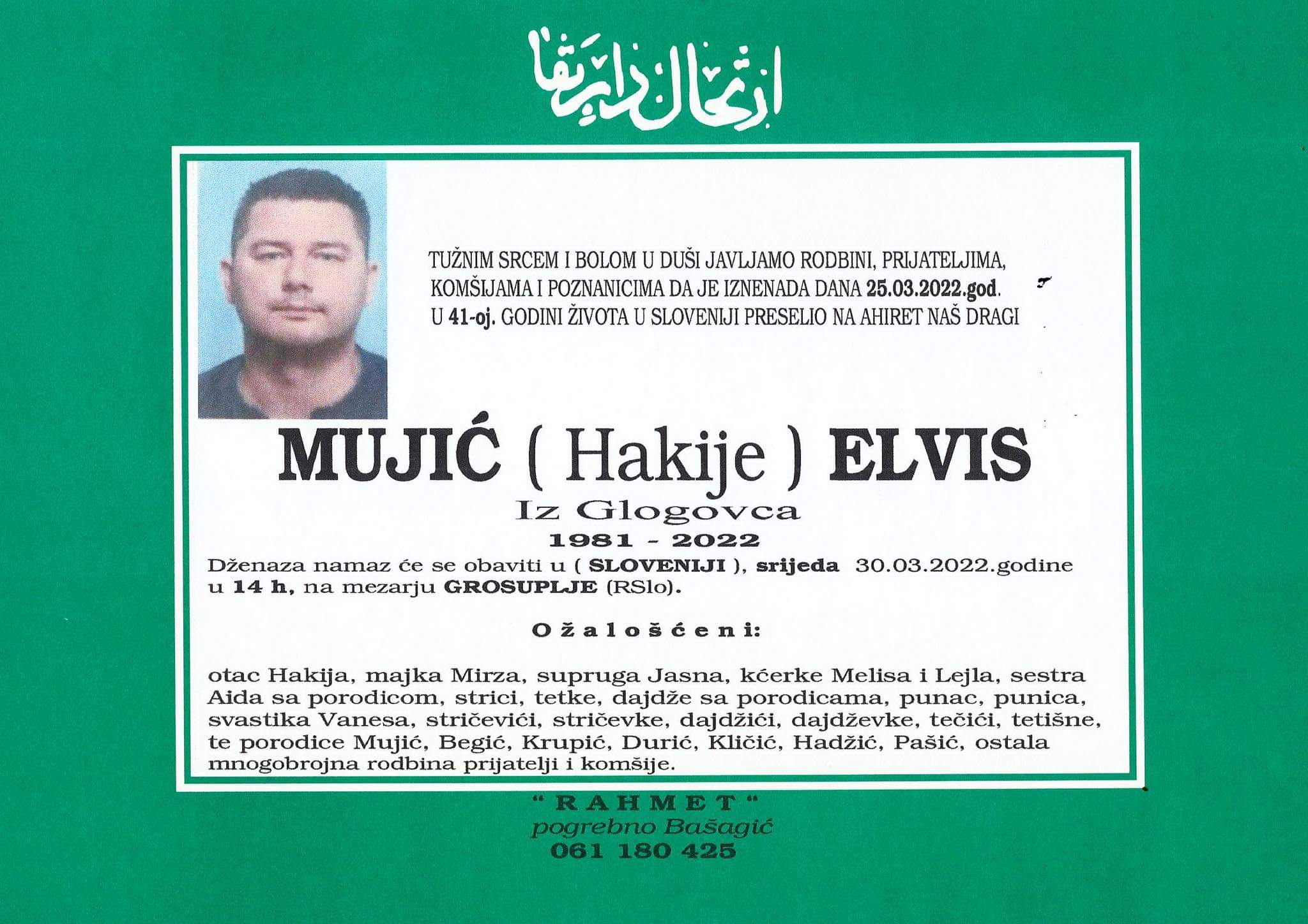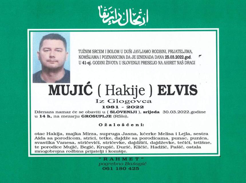 Tužnog srca i s bolom u duši obavještavamo rodbinu, komšije i prijatelje da je naš dragi Mujić (Hakije) Elvis u 41. godini života preselio na Ahiret.