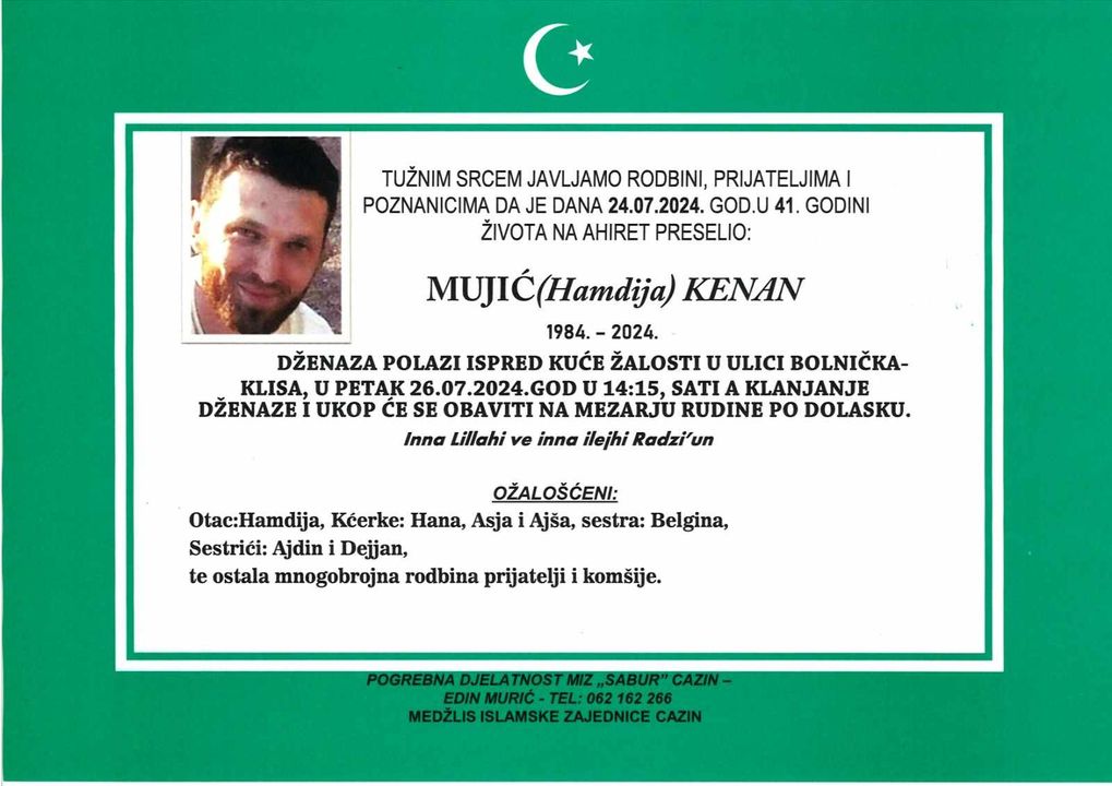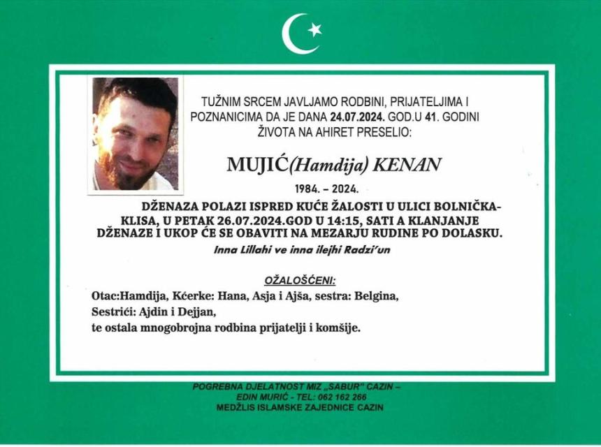 Tužnim srcem javljamo rodbini, prijateljima i poznanicima da je dana 24.07.2024. godine u 41-oj godini života na Ahiret preselio Mujić (Hamdija) Kenan.