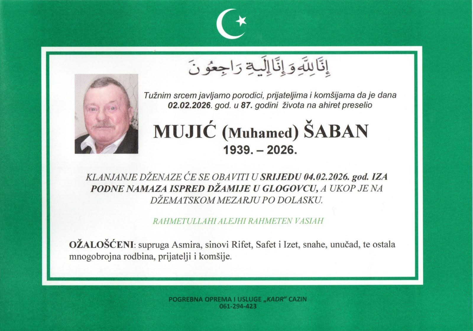 Klanjanje dženaze obavit će se u srijedu, 04.02.2026. godine, iza podne-namaza ispred džamije u Glogovcu, a ukop je na džematskom mezarju po dolasku.