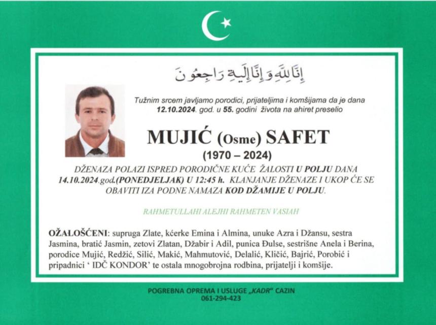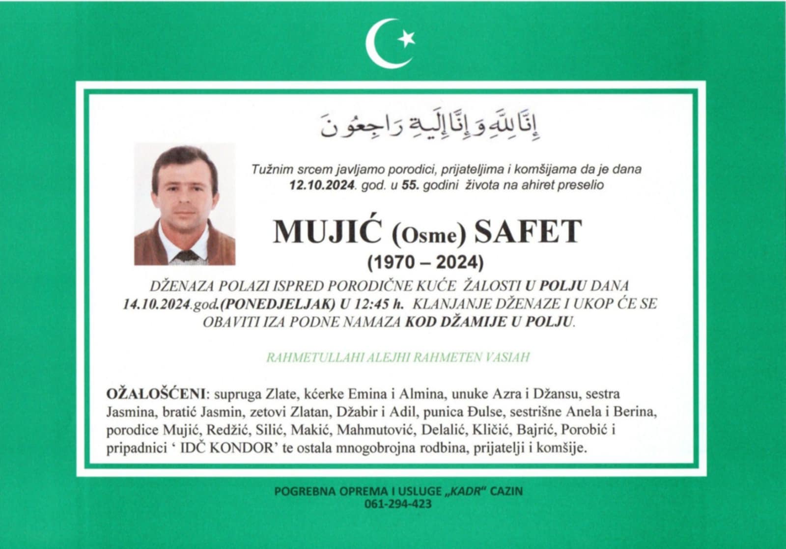 Tužnim srcem i bolom u duši javljamo rodbini, prijateljima i komšijama da je naš dragi Mujić (Osme) Safet, dana 12.10.2024. godine u 55. godini života, preselio na ahiret.