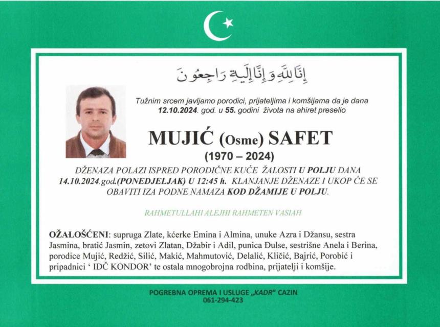Obavještavamo rodbinu i prijatelje da je 12.10.2024 godine na ahiret u 55. godini života preselio MUJIĆ (Osme) SAFET.