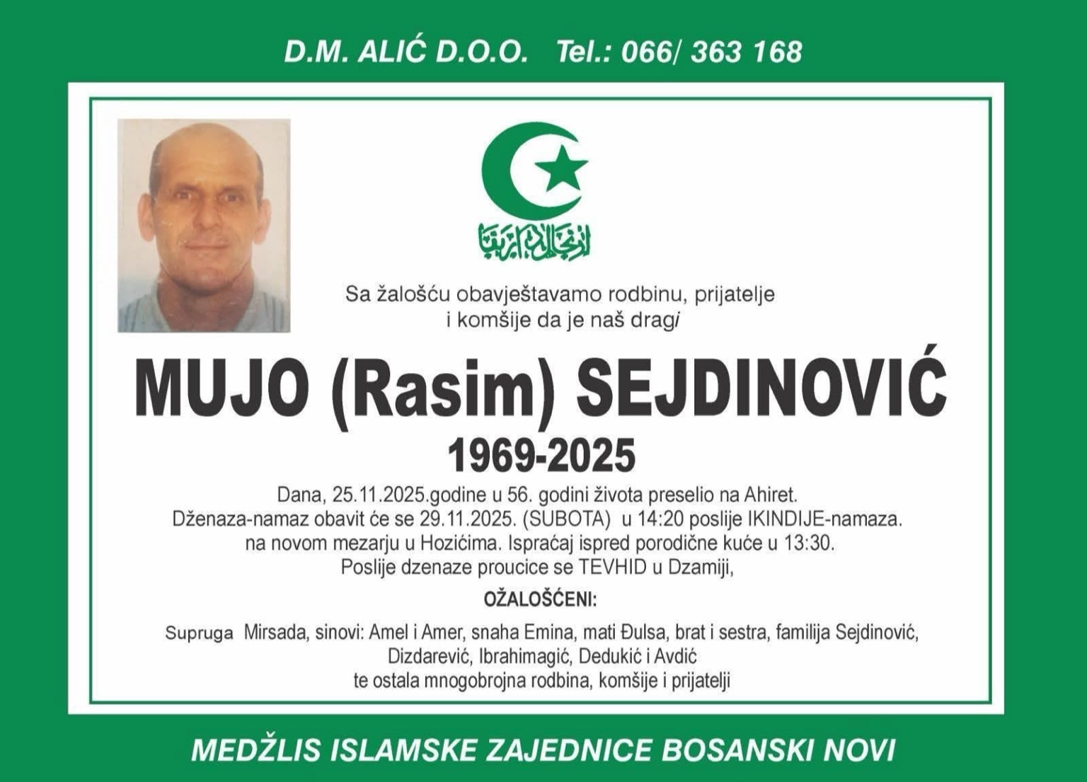 Dženaza-namaz obavit će se 29.11.2025. (SUBOTA) u 14:20 poslije IKINDIJE-namaza na novom mezarju u Hozićima. Ispraćaj ispred porodične kuće u 13:30.