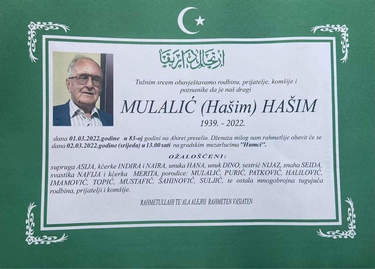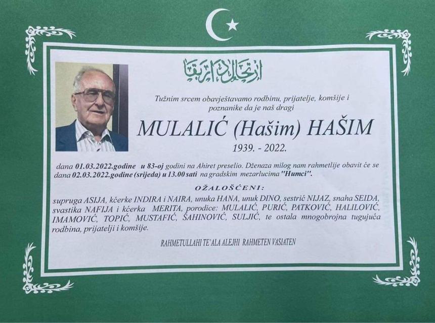 Tužnog srca i s bolom u duši obavještavamo rodbinu, komšije i prijatelje da je naš dragi Mulalić (Hašim) Hašim 1.03.2022. u 83. godini života preselio na Ahiret.