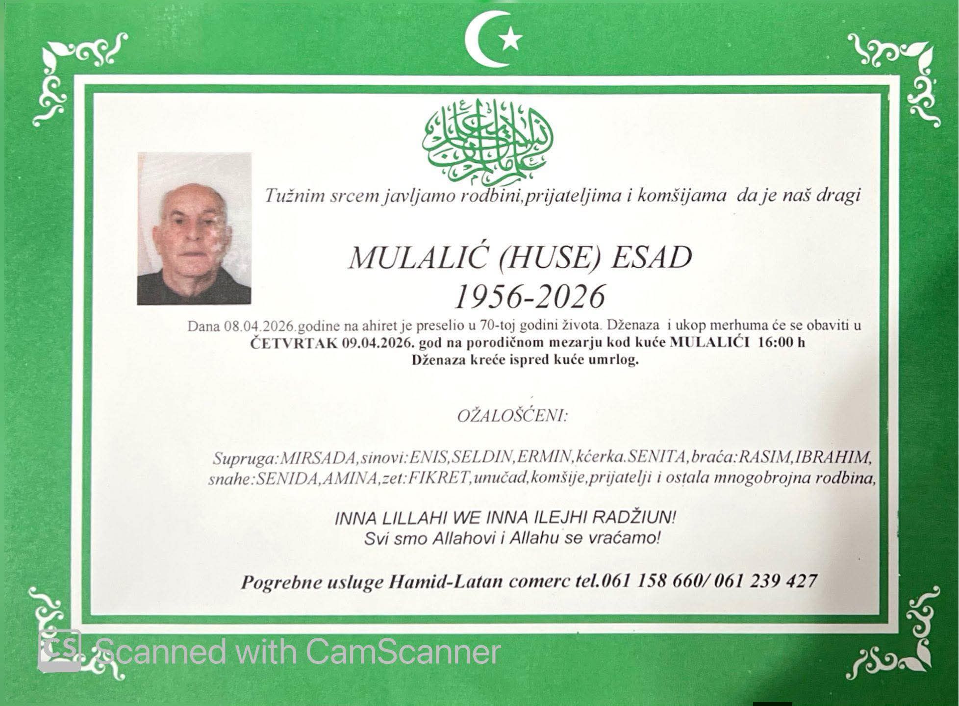 Dženaza i ukop merhuma će se obaviti u ČETVRTAK 09.04.2026. god na porodičnom mezarju kod kuće MULALIĆI 16:00 h.