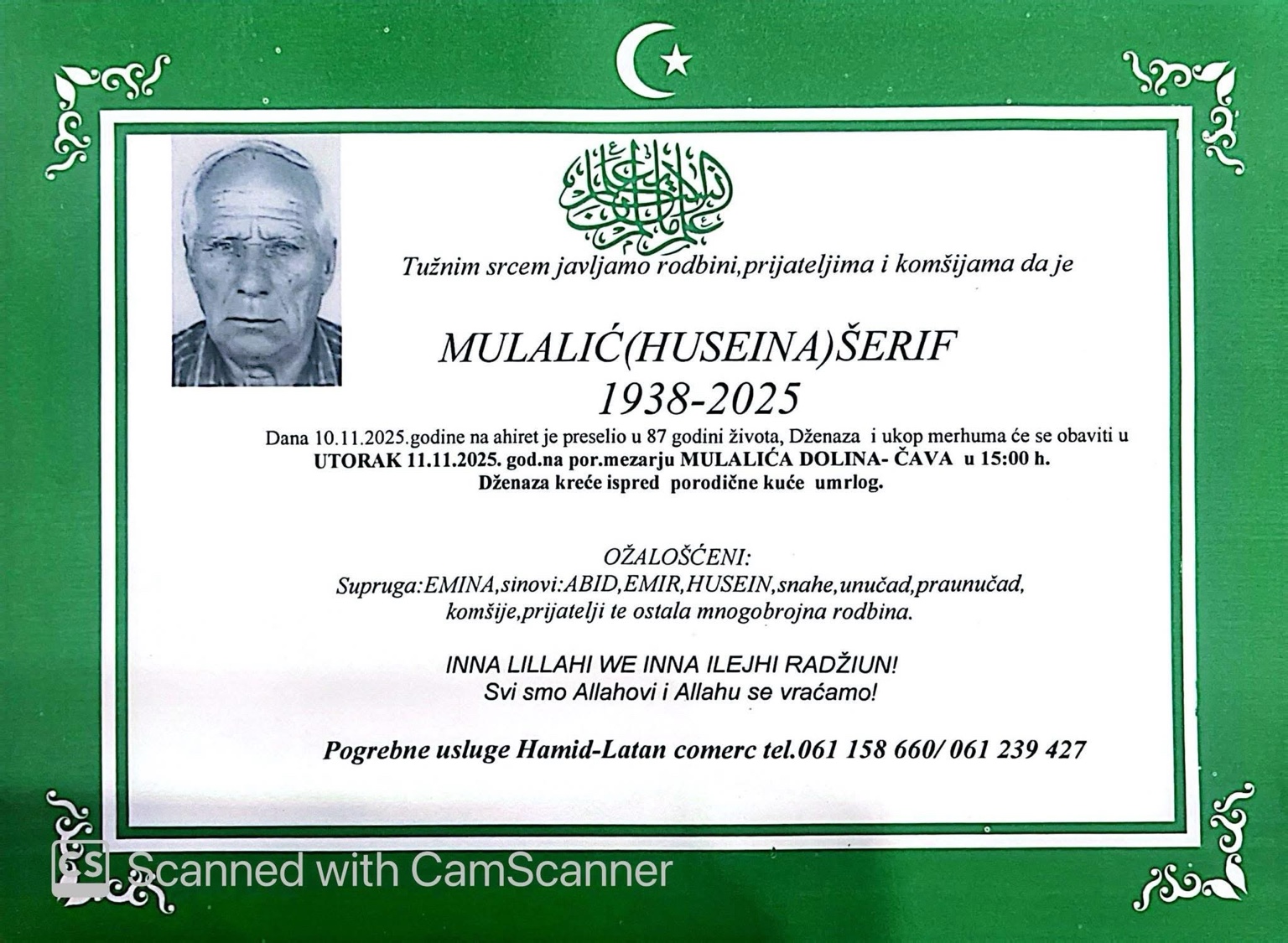 Dana 10.11.2025. godine na ahiret je preselio u 87. godini života. Dženaza i ukop merhuma će se obaviti u utorak, 11.11.2025. godine na porodičnom mezarju MULALIĆA DOLINA – ĆAVA u 15:00 sati.