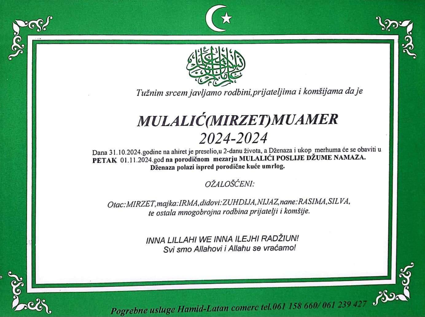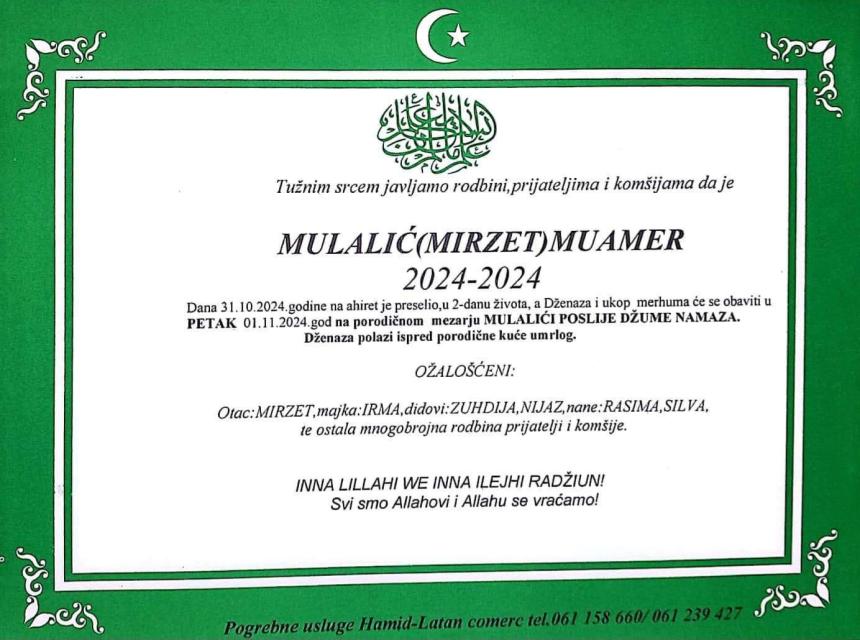 Tužnim srcem javljamo rodbini, prijateljima i komšijama da je naš dragi Mulalić (Mirzet) Muamer preselio na Ahiret dana 31.10.2024. godine u drugom danu života.