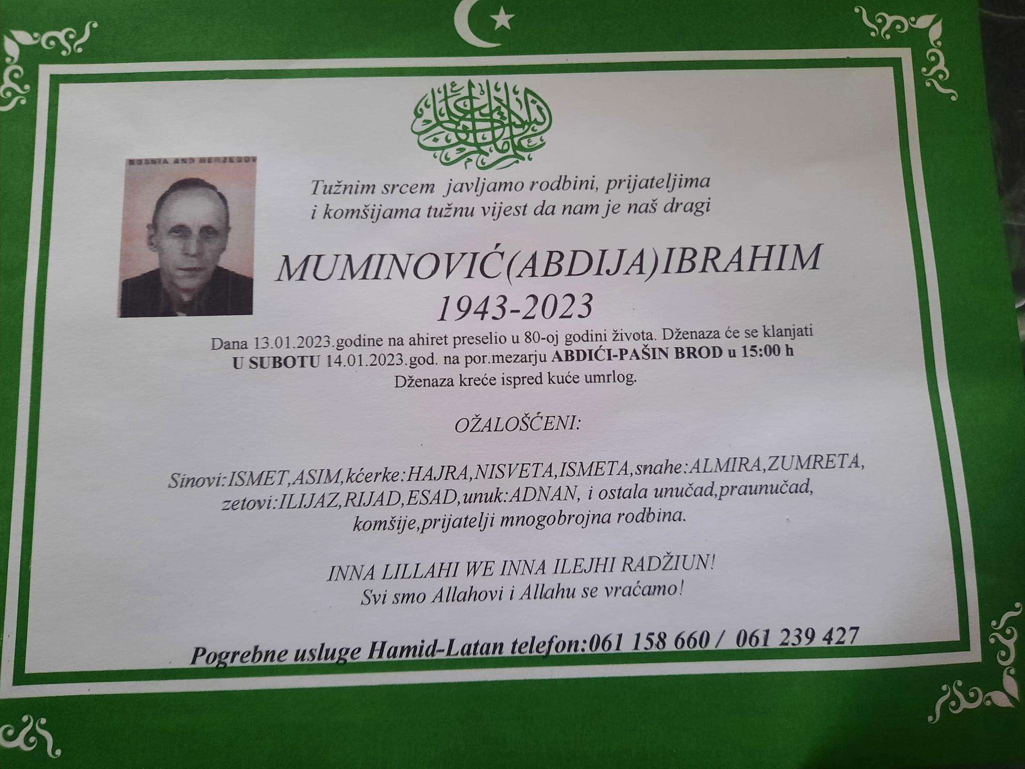 Tužnim srcem i bolom u duši javljamo rodbini, prijateljima i poznanicima da je naš dragi Muminović (Abdija) Ibrahim, dana 13.01.2023. godine u 80-oj godini života, preselio na Ahiret.