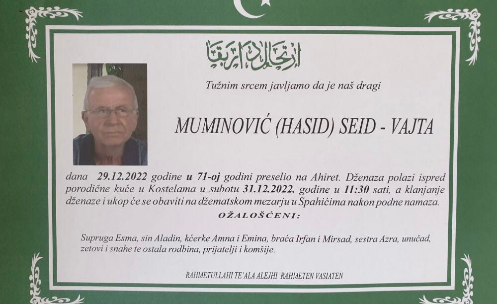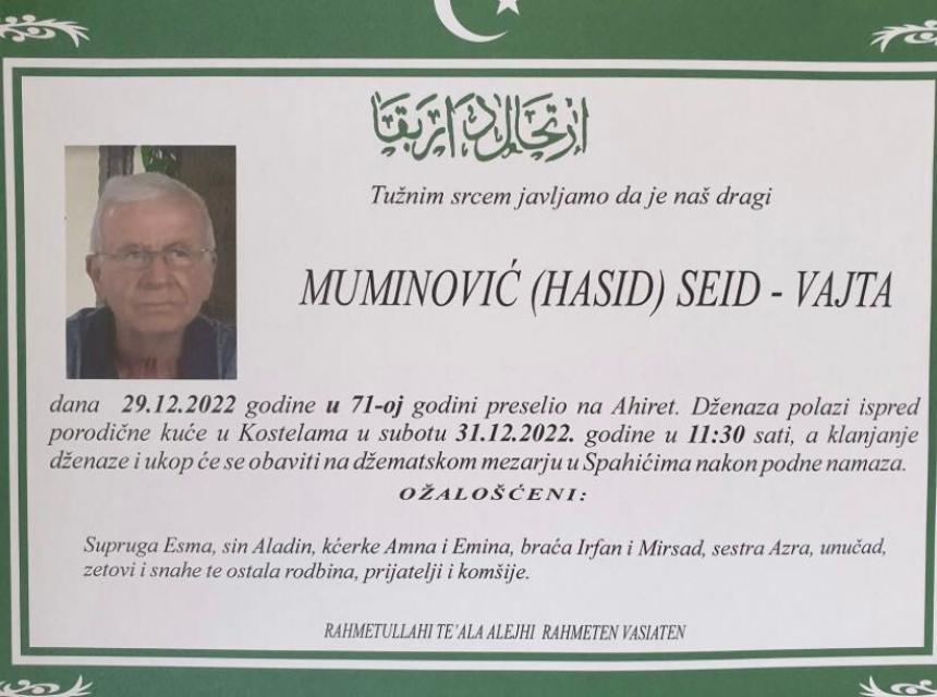 Obavještavamo rodbinu, prijatelje i komšije da je naš dragi Muminović (Hasid) Seid - Vajta, dana 29.12.2022. godine u 71-oj godini života, preselio na Ahiret.